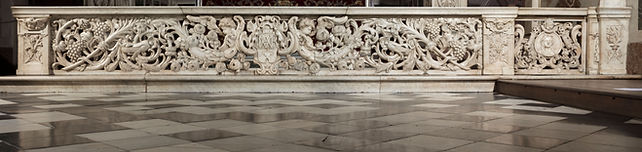 Quant au banc de communion qui traverse de part en part la nef, il présente, au sein d’arabesques à la mode française s’accordant avec le décor de la chaire et des lambris des bas-côtés, des médaillons quadrilobés à thèmes eucharistiques, tels que l’épisode de la manne, l’autel du sacrifice, les épis de blé, le raisin, l’agneau de l’apocalypse ou encore le pélican nourrissant ses petits.