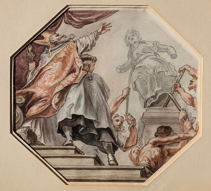 Dans le même ordre d’idées, une autre déclinaison du thème de la victoire du catholicisme sur le paganisme réside dans les images d’idoles ou de statues païennes en train de tomber face au triomphe de la foi catholique. Il en est ainsi, sur les plafonds des collatéraux, de la scène dépeignant saint Jean Chrysostome qui ordonne la démolition de la statue de l’impératrice Euxodie ou encore de la scène de sainte Eugénie dont Rubens a représenté l’épisode de sa décapitation et celui où elle pria dans le temple de Diane à Rome, provoquant un tremblement de terre et la chute des idoles païennes. Ces peintures des collatéraux font écho à la peinture du chœur figurant François-Xavier et des Indiens qui regardent avec terreur un rayon de lumière détruire les idoles de leurs temples, mettant encore en œuvre des relations visuelles et thématiques entre les plafonds des bas-côtés et le chœur.