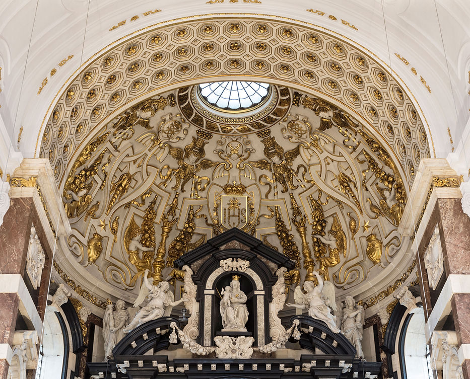 Le retable est surmonté d’une sculpture de la Vierge, patronne de l’église, présentant l’enfant (actuellement en plâtre mais originellement en marbre). La niche sommitale qui l’abrite interrompt non seulement le fronton de l’autel mais dépasse également le niveau de la corniche architecturale qui marque la frontière entre le revêtement mural de marbre blanc et la voûte en cul-de-four. Celle-ci est baignée de la lumière céleste provenant de l’oculus sommital se reflétant dans les entrelacs dorés, rappelant que le Christ est le vrai médiateur qui rompt les barrières entre le monde terrestre et le monde spirituel. Et ce n’est pas un hasard si la partie haute de l’autel est décorée d’anges, ces êtres intermédiaires qui manifestent la présence céleste et apportent la lumière de Dieu pendant la célébration eucharistique qui a lieu sur l’autel.